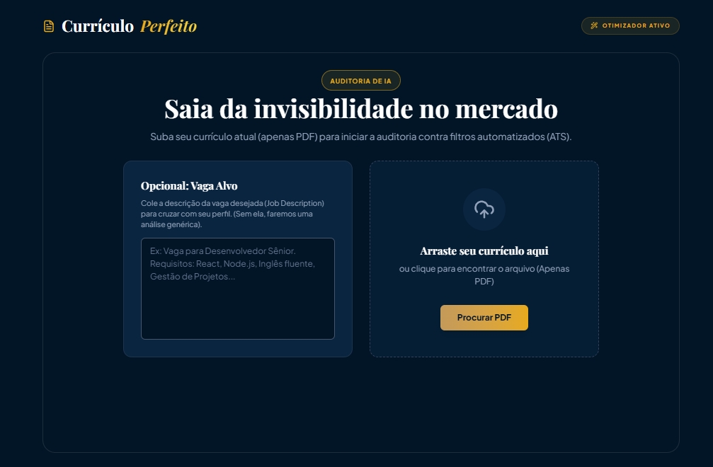 Pare de ser rejeitado por robôs. Nossa IA audita seu currículo em segundos, conserta seus erros fatais e te entrega o mapa para abordar as empresas da sua região direto no WhatsApp. Tudo isso por menos que o valor de uma passagem de ônibus.